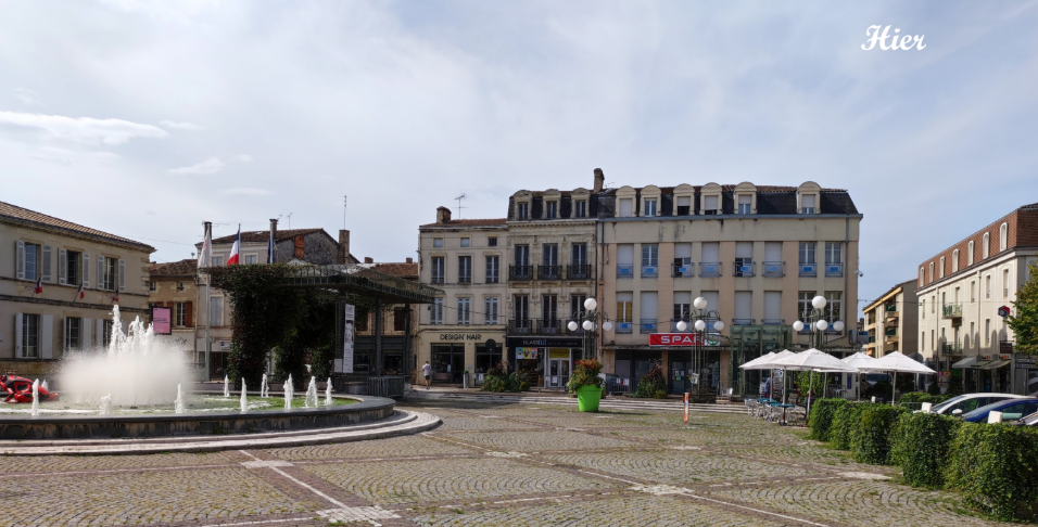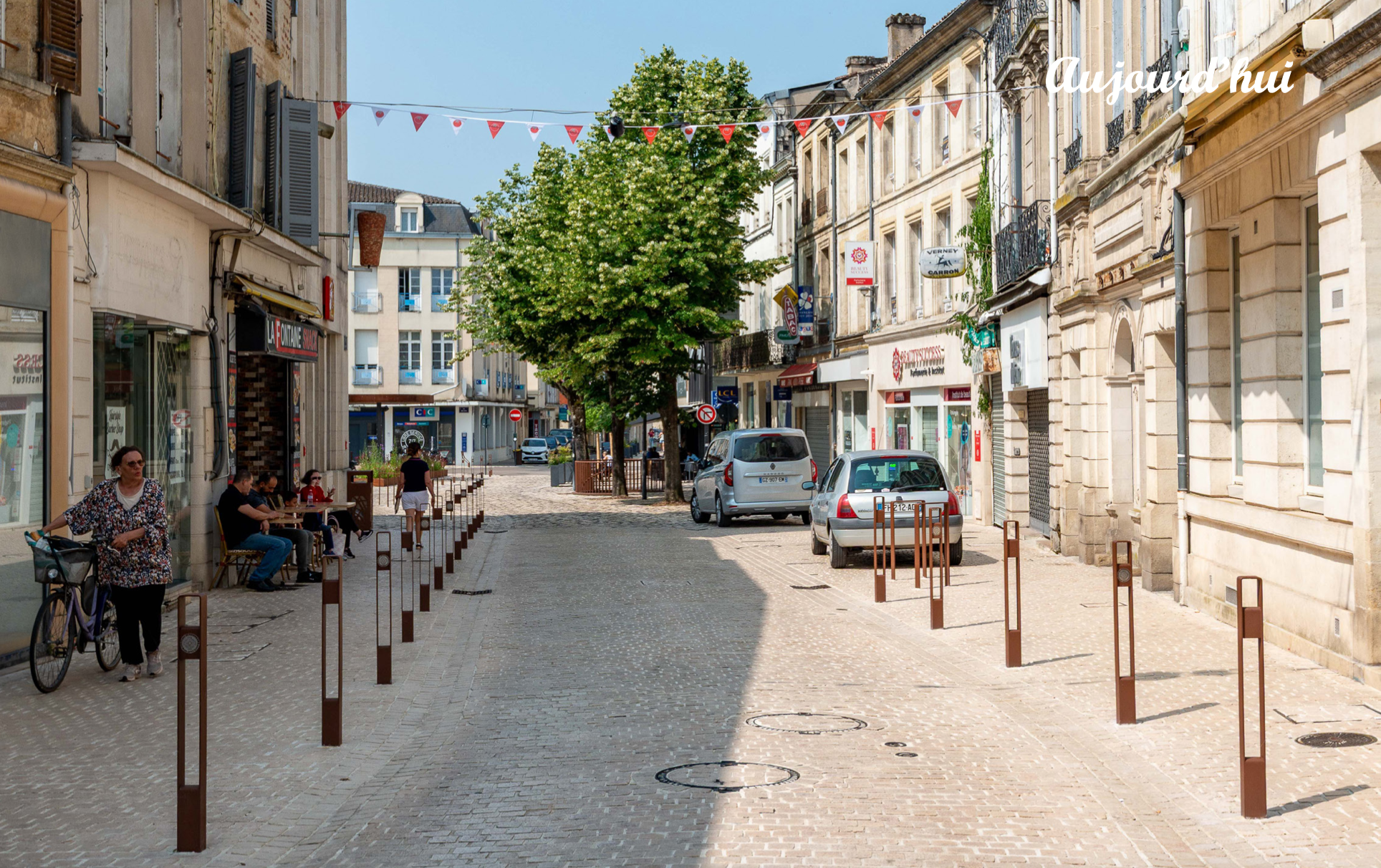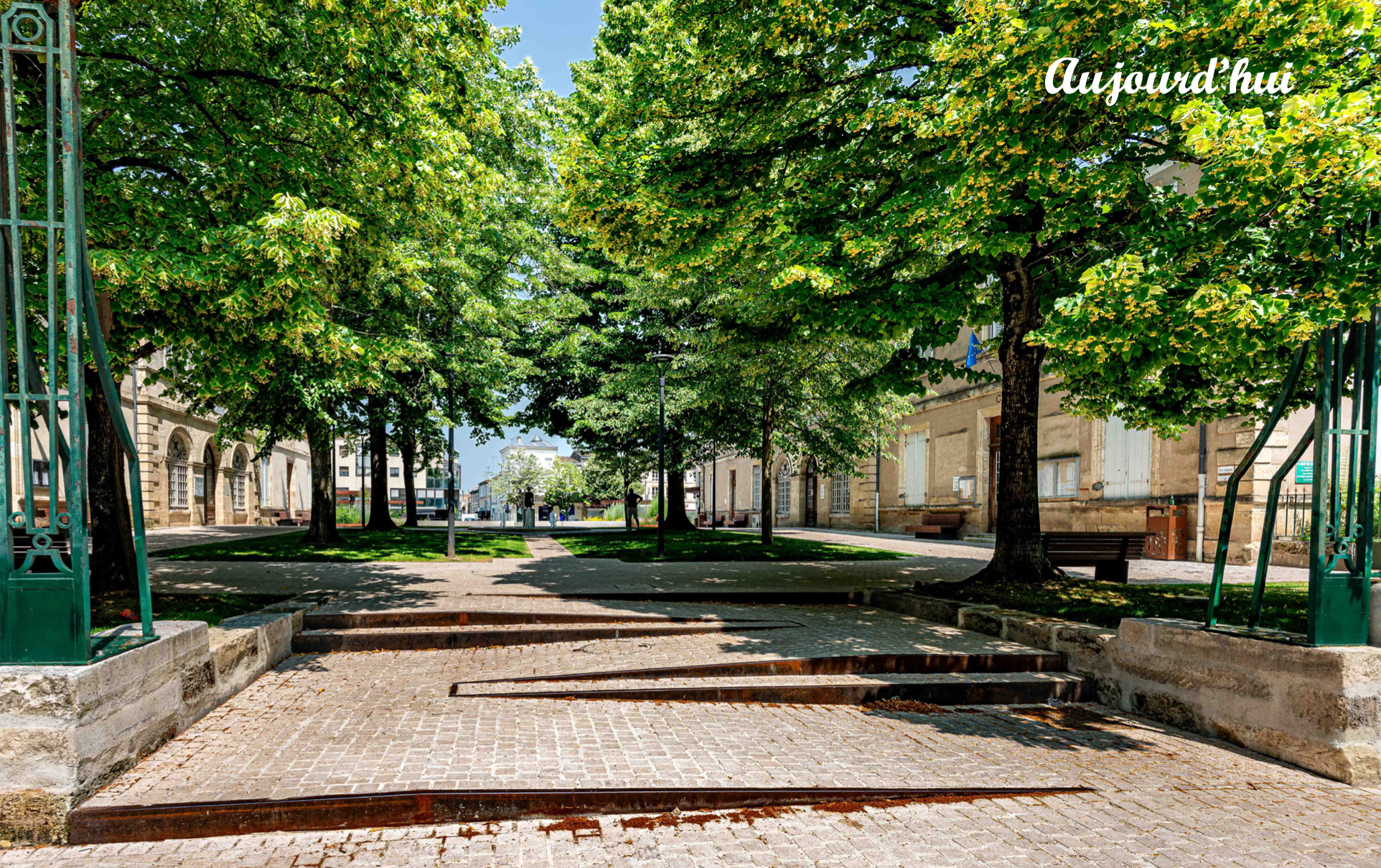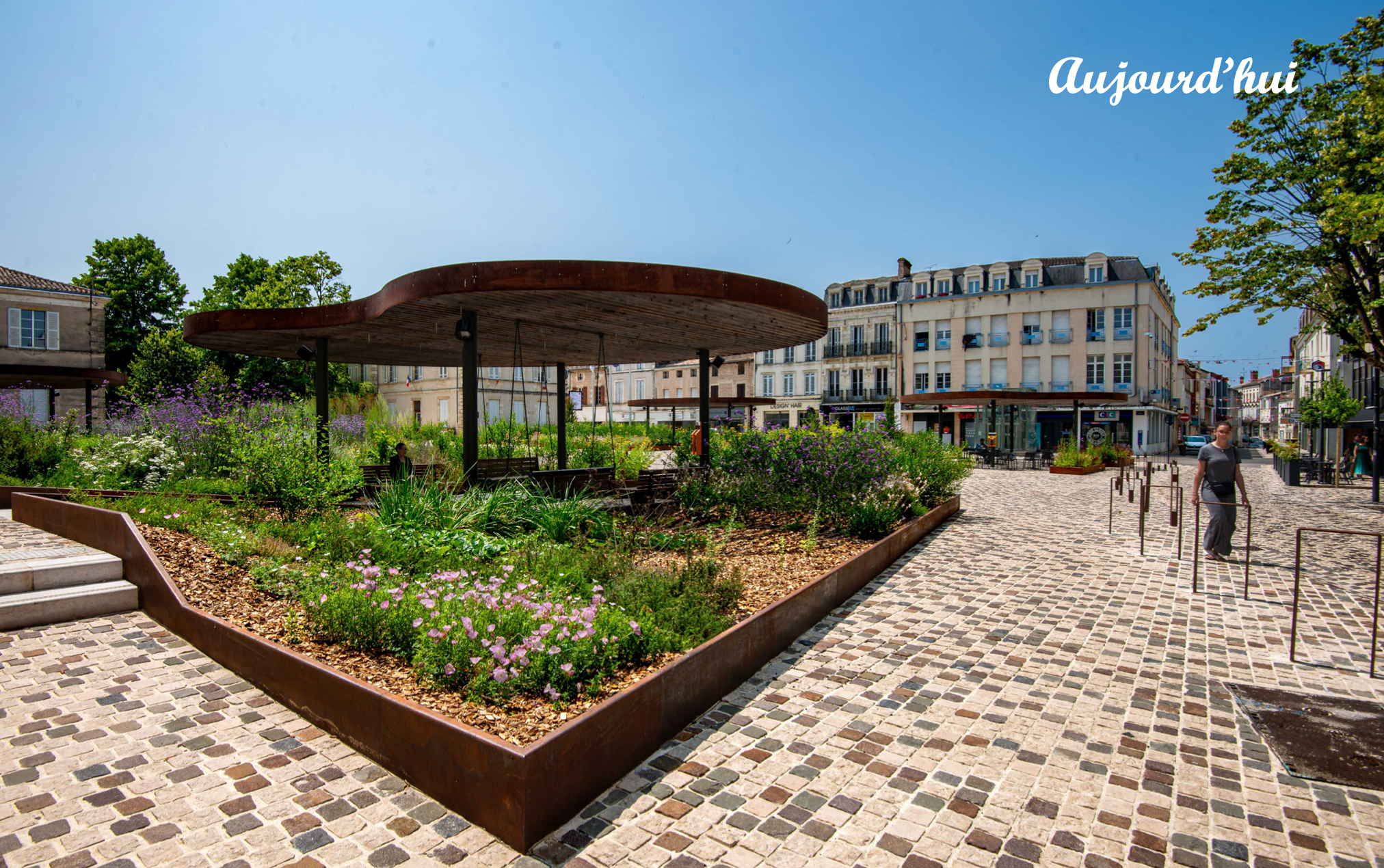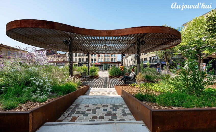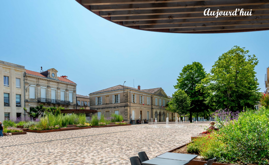 Aujourd’hui, la transformation saute aux yeux. La place Clemenceau, entièrement redessinée, devient un espace central, unifié et accueillant. Pavés panachés, pergolas végétalisées, fontaine sèche, bancs et zones de repos offrent un nouvel art de vivre au cœur de Marmande.