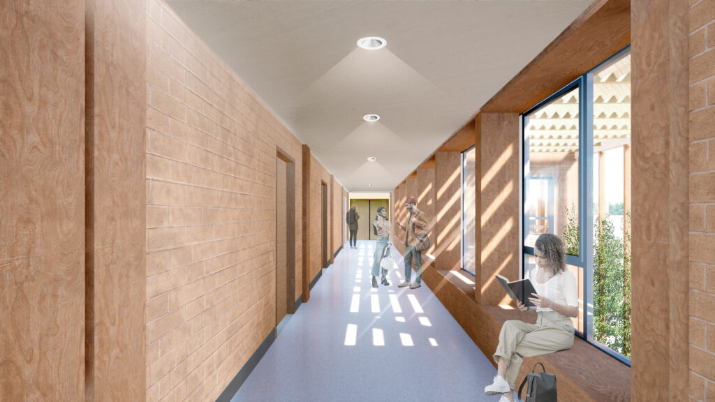 • Une structure bois assumée et expressive, visible dans les salles de classe, avec des solivages mis en valeur dans l’architecture pédagogique.