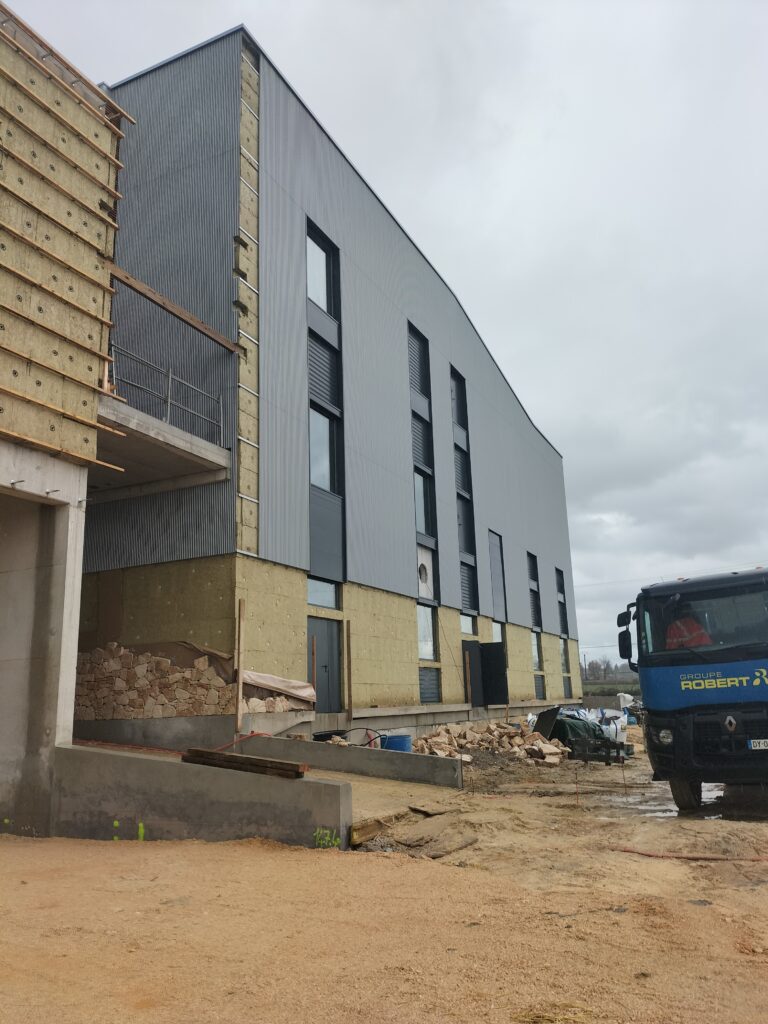 Aujourd’hui, ces partis pris se matérialisent pleinement sur site : la pose des parements pierre en façade est engagée et une partie des enduits terre est désormais finalisée, notamment grâce à l’utilisation de près de 1 000 m² de terre crue issue du site. Ces finitions naturelles renforcent l’identité architecturale du projet tout en valorisant l’usage de matériaux biosourcés.