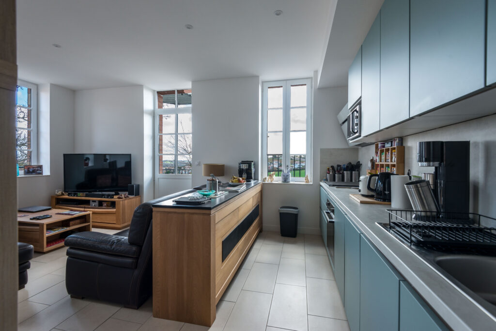 Longtemps laissé à l’abandon, ce patrimoine a fait l’objet d’une réhabilitation ambitieuse, transformant 354 m² existants en 465 m² de surface projetée, pour accueillir 6 logements (T2 et T3).