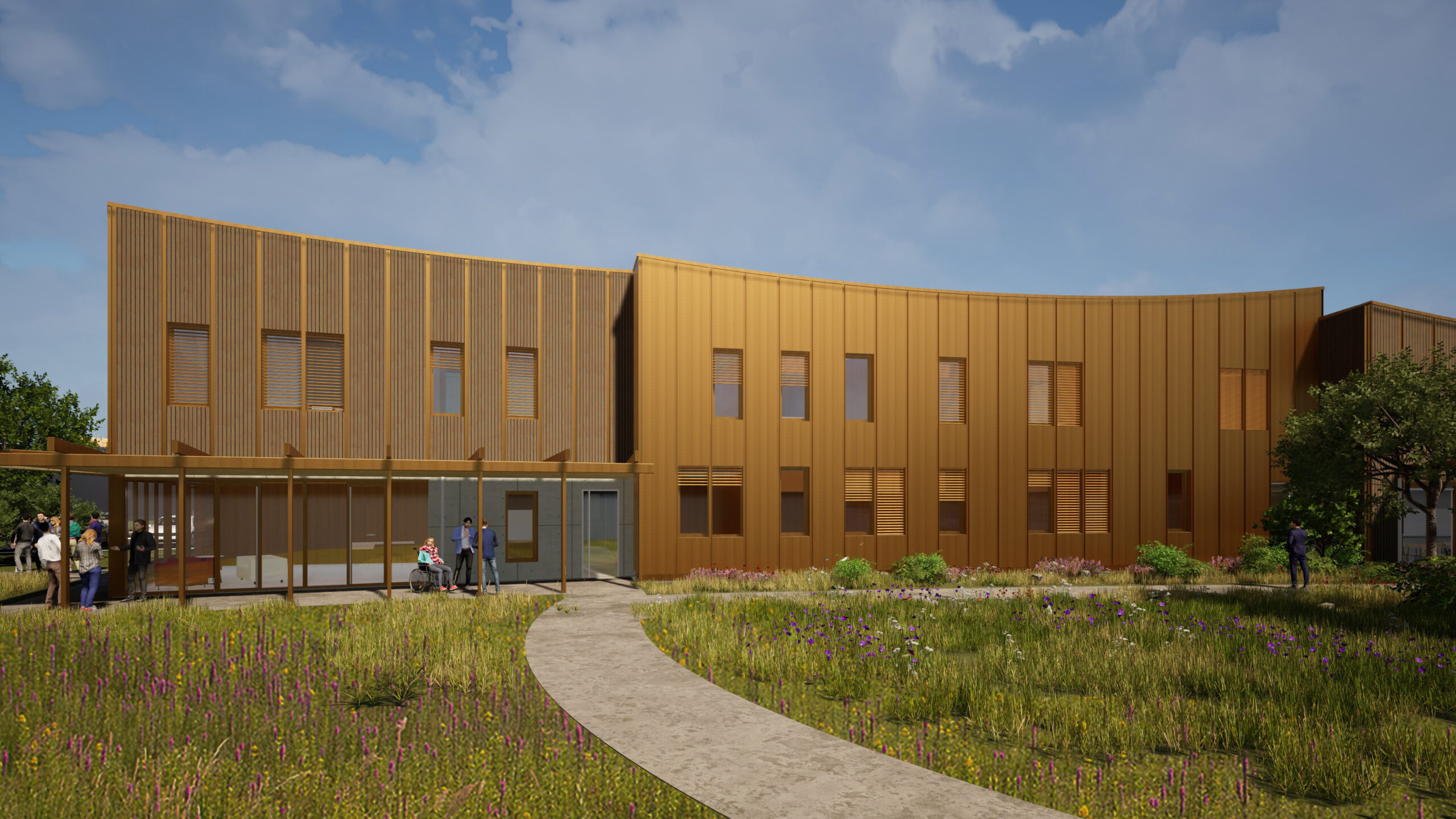 Des éléments verticaux dorés viennent ponctuer l’enveloppe. Insérés dans les bardages bois et métalliques, ces motifs symbolisent la valeur de la connaissance et de l’innovation scientifique. Leur teinte dorée reflète la lumière et souligne les circulations verticales et les points nodaux du bâtiment, offrant une lecture symbolique et contemporaine du rôle des laboratoires : des lieux de savoir ancrés dans le territoire.